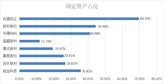 下表为2019年硅宝科技及其同行业竞争者的固定资产占比数据,可以发现该行业下列企业中,固定资产占比在11.74%—69.7%之间,硅宝科技的运营资产占比处于主要竞争对手中的中上水平。