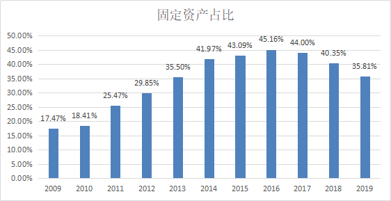 从纵向分析来看,硅宝科技的固定资产占比呈先上升后下降的趋势(由2009年的17.47%上升到2016年的45.16%,然后下降至2019年的35.81%),说明瑰硅宝科技在2016年开始削弱对固定资产的投资(进行产能升级)。