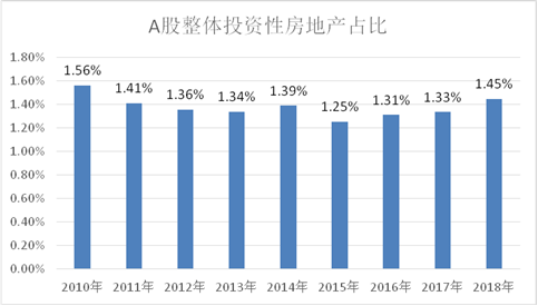 以A股上市,剔除金融企业后的所有公司全样本分析计算,投资性房地产占总资产的比例呈现缓慢下降的趋势,由2010年的1.56%降至2018年的1.45%,九年平均值为1.38%。