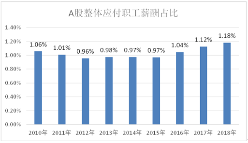 以A股上市,剔除金融企业后的所有公司全样本分析计算,应付职工薪酬占总资产的比例呈现缓慢上升的趋势,由2010年的1.06%升至2018年的1.18%,九年平均值为1.03%。