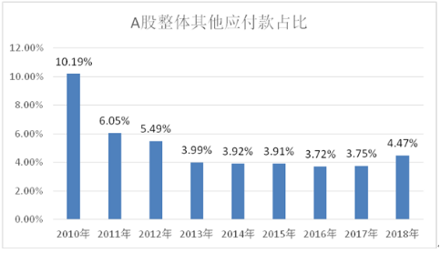 以A股上市,剔除金融企业后的所有公司全样本分析计算,其他应付款占总资产的比例呈现下降的趋势,由2010年的10.19%降至2018年的4.47%,九年平均值为5.06%。