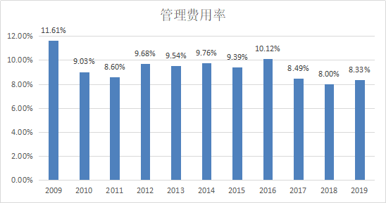纵向分析来看,硅宝科技的管理费用率近11年间主要在8%到10%之间波动。