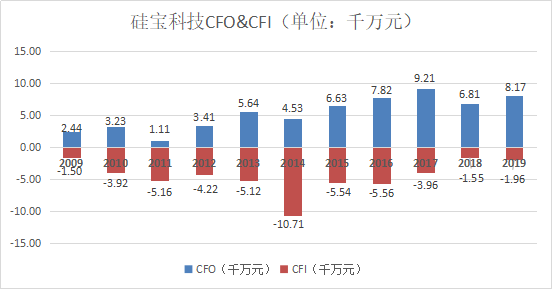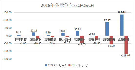 下图为2019年硅宝科技及其竞争企业的经营性现金流量净额(CFO)及投资性现金流量净额(CFI)对比,可以发现2019年硅宝科技经营活动产生的现金流量净额以及投资活动所耗费的现金流量净额均处于较低水平,该结果一方面说明硅宝科技经营活动在市场中所占的份额比较小,另一方面说明硅宝科技的投资扩张力度在全行业中也相对更弱。