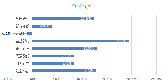 下表为2019年硅宝科技及其同行业竞争者的净利率数据,该行业下列企业中,净利率在3.86%—13.94%之间,硅宝科技的净利率处于主要竞争对手中的顶部水平。