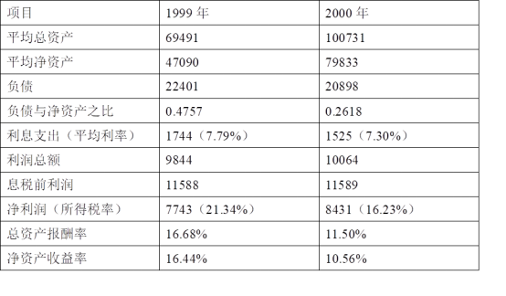 可见,公司2000年净资产收益率下降主要是由于总资产报酬率下降引起的;其次,资本结构变动也为净资产收益率下降带来不利影响,它们使净资产收益率下降了6.72%;利息率和所得税率下降给净资产收益本提高带来有利影响,使其提高了0.85%;二者相抵,净资产收益率比上年下降5.88%