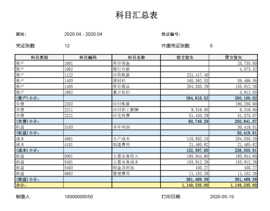 (一)一级科目汇总表